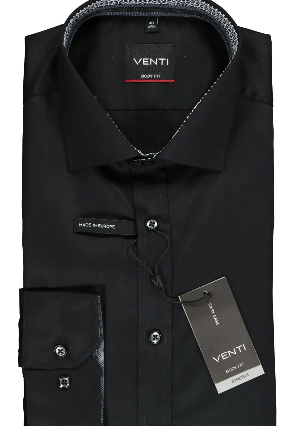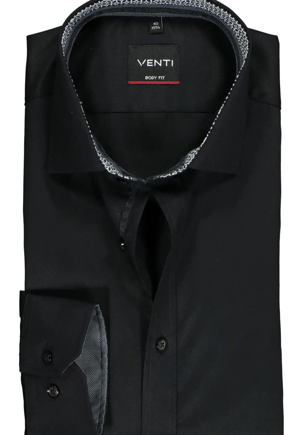 Zwart strak getailleerd VENTI body fit overhemd in een twill weving met lange mouwen. De boord van de Kent kraag heeft twee verschillende contrasten in de vorm van een structuurstof en een dessin, beide met zwart en wit. In de manchetten komt de structuurstof weer terug en over de knooplijst loopt een zwart satijnen biesje en het shirt sluit met zwarte knoopjes. Strijkvriendelijk overhemd in een mooie twill weving van 100% katoen. Uitgevoerd met een smalle schouderpas, taillenaden aan de voor-en achterzijde een een subtiel logo borduursel op de linker manchet.